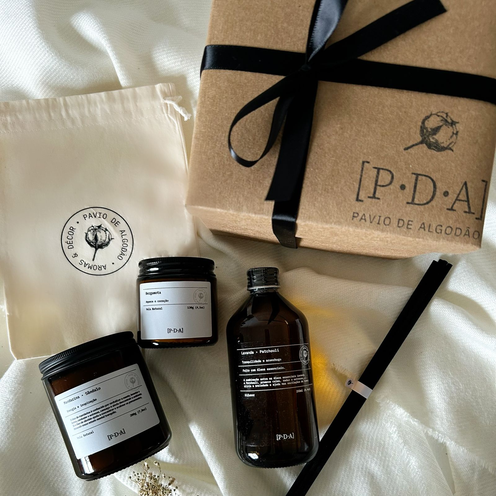 Composto por: 1 embalagem para presente, 1 Vela Natural Bergamota (130g), 1 Vela Natural Mandarina + Sândalo (200g), 1 Difusor Lavanda + Patchouli (250ml) e 1 Saquinho de Algodão Cru.