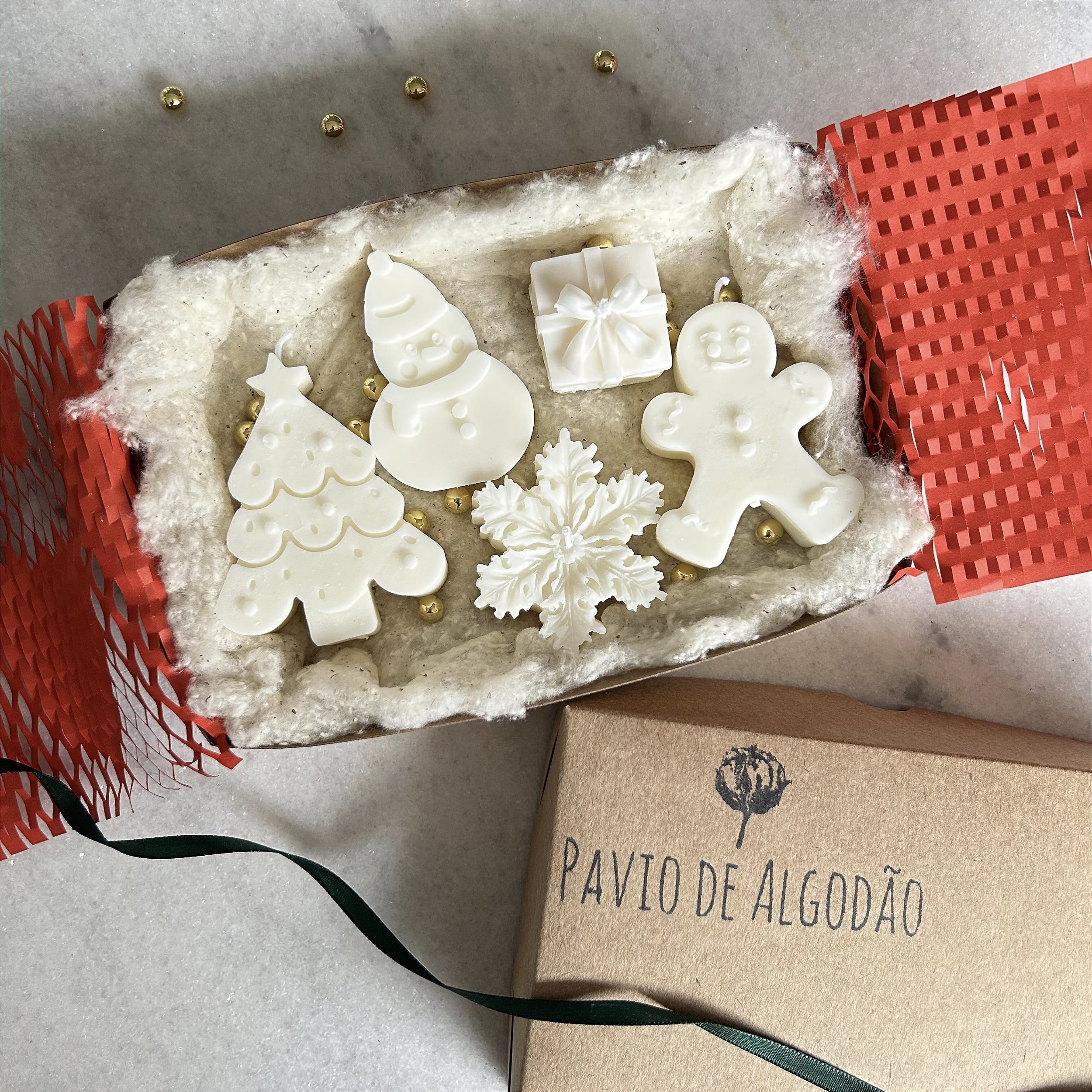 O kit contém: 1 vela árvore de natal, 1 boneco natalino, 1 floco de neve, 1 boneco de neve, 1 presentinho e uma caixa kraft de presente.